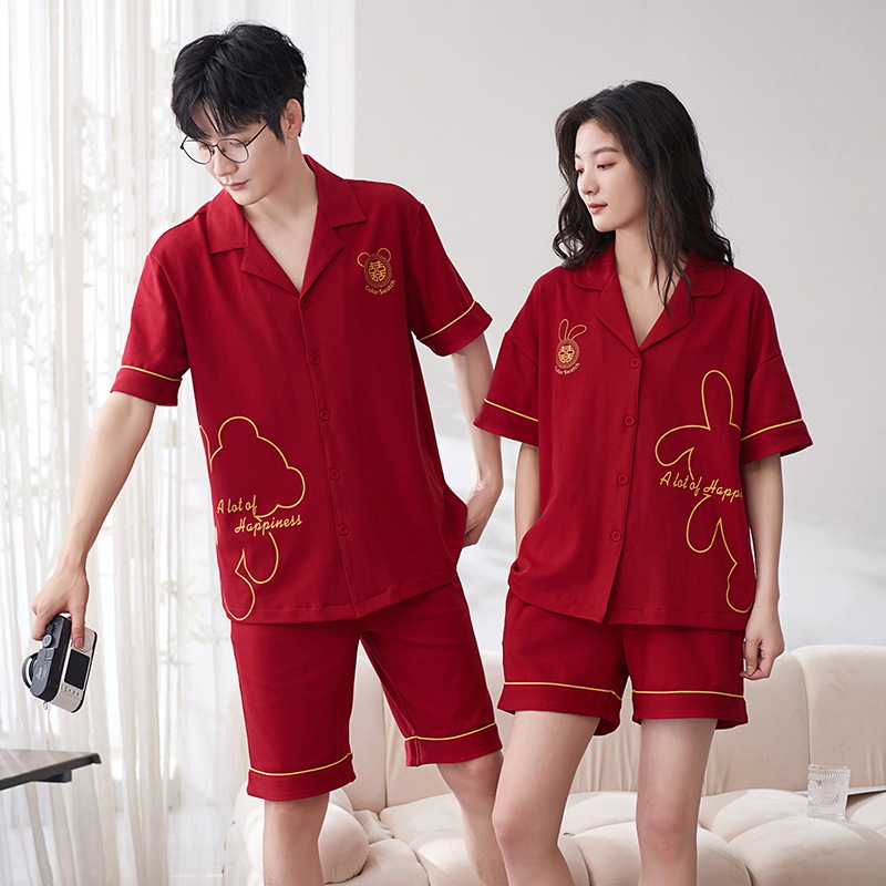 クラスA抗菌赤お祝い新婚結婚カップル純綿パジャマ女性夏半袖本命年ホームウェア男性