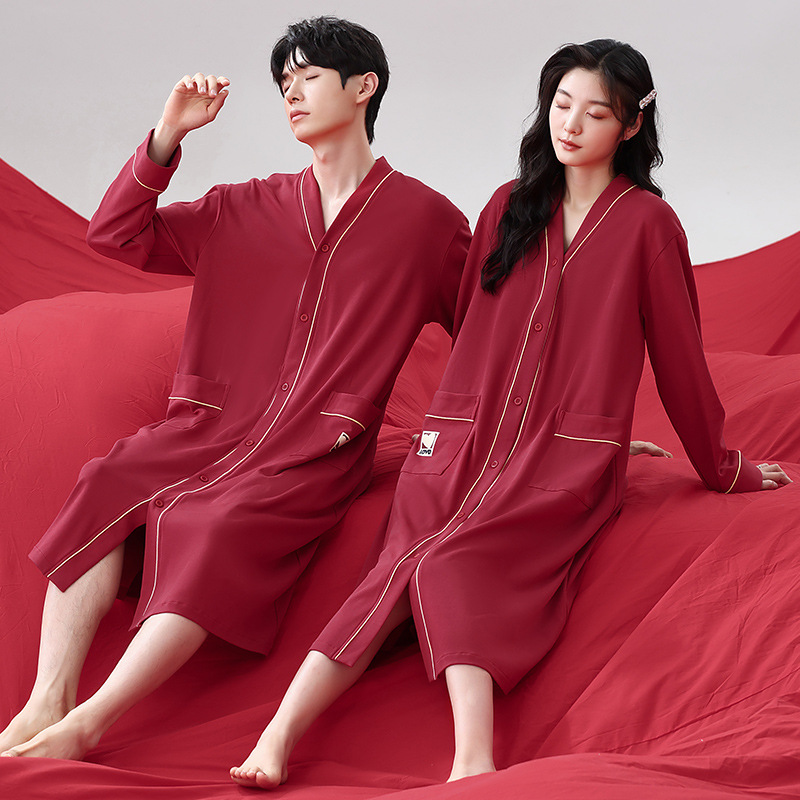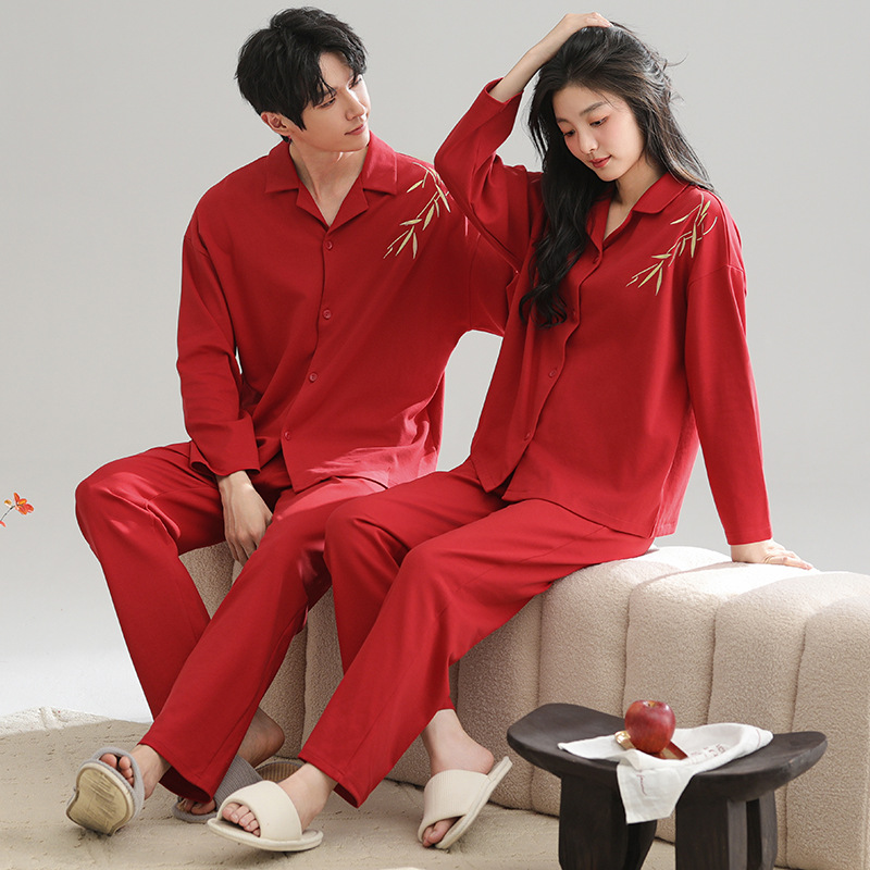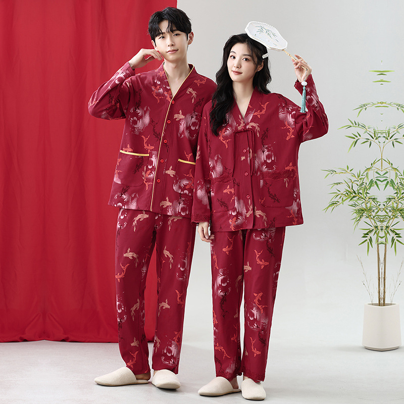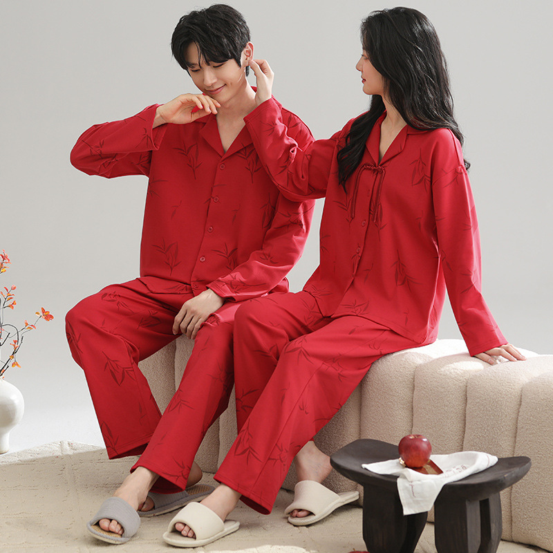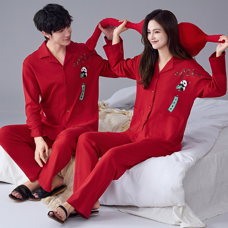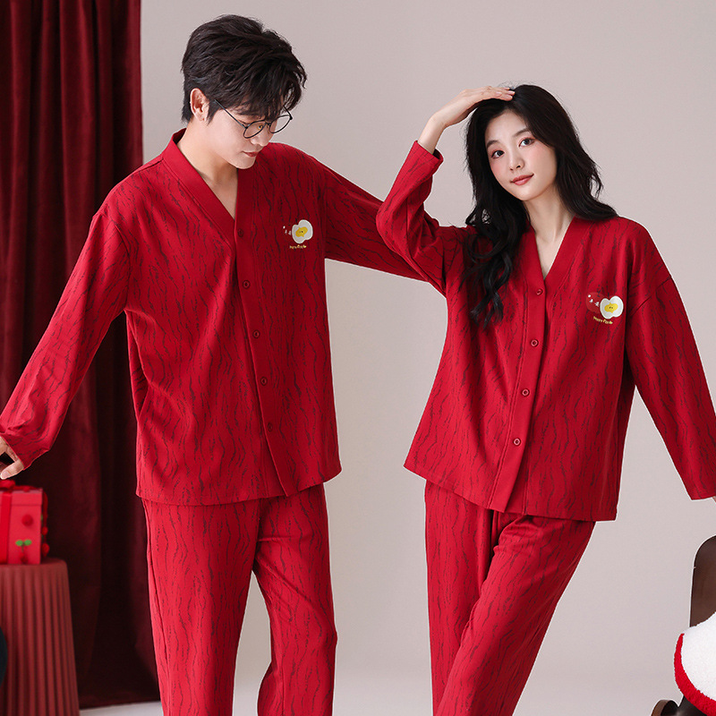 秋冬の純綿長袖カップルパジャマ女性カーディガン赤い本命年新婚祝い男性ホームウェア