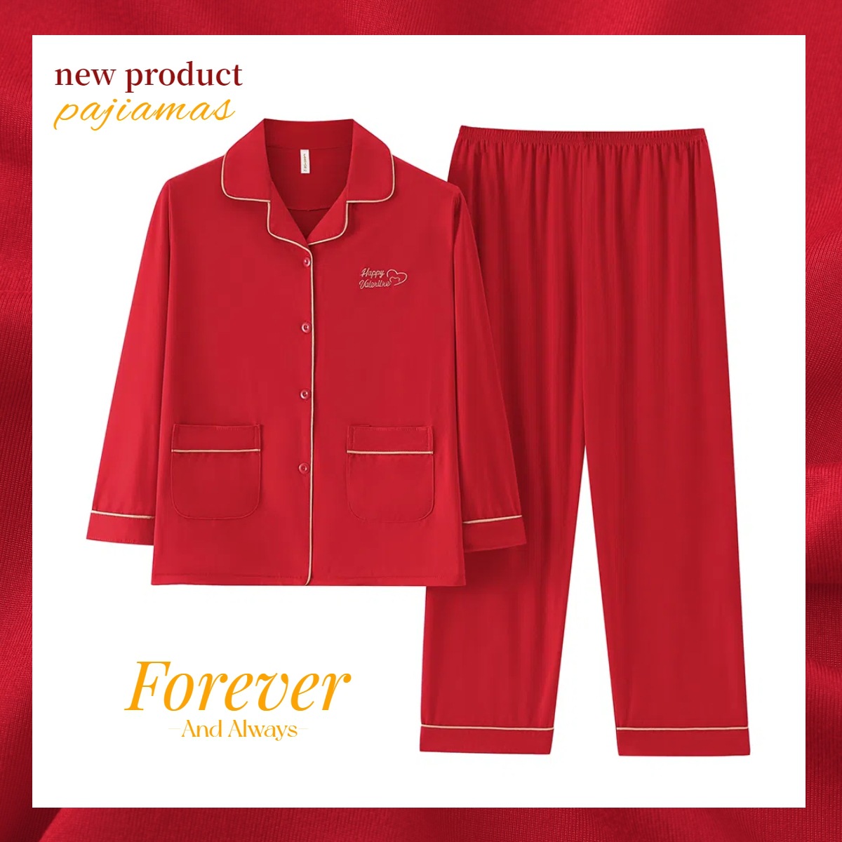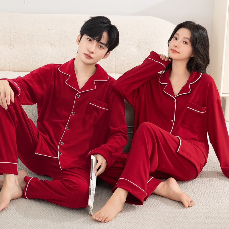 カップルパジャマ女性秋のカーディガン長袖ワインレッド本命年秋冬結婚ホームウェア結婚男性スーツ