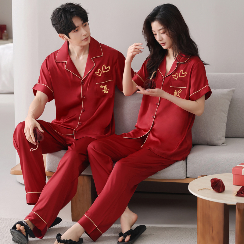 夏の結婚式のカップル赤氷と雪のシルクパジャマ女性のカーディガン半袖ズボンハイエンドプラスサイズメンズホーム服