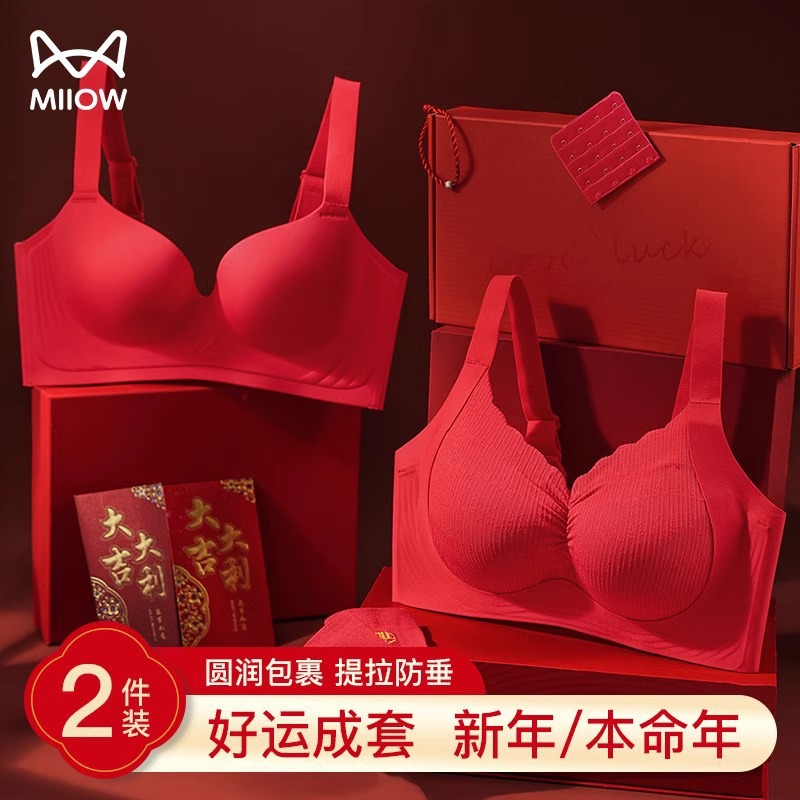 大红色本命年无痕内衣女小胸聚拢舒适无钢圈结婚红色文胸套装盒装