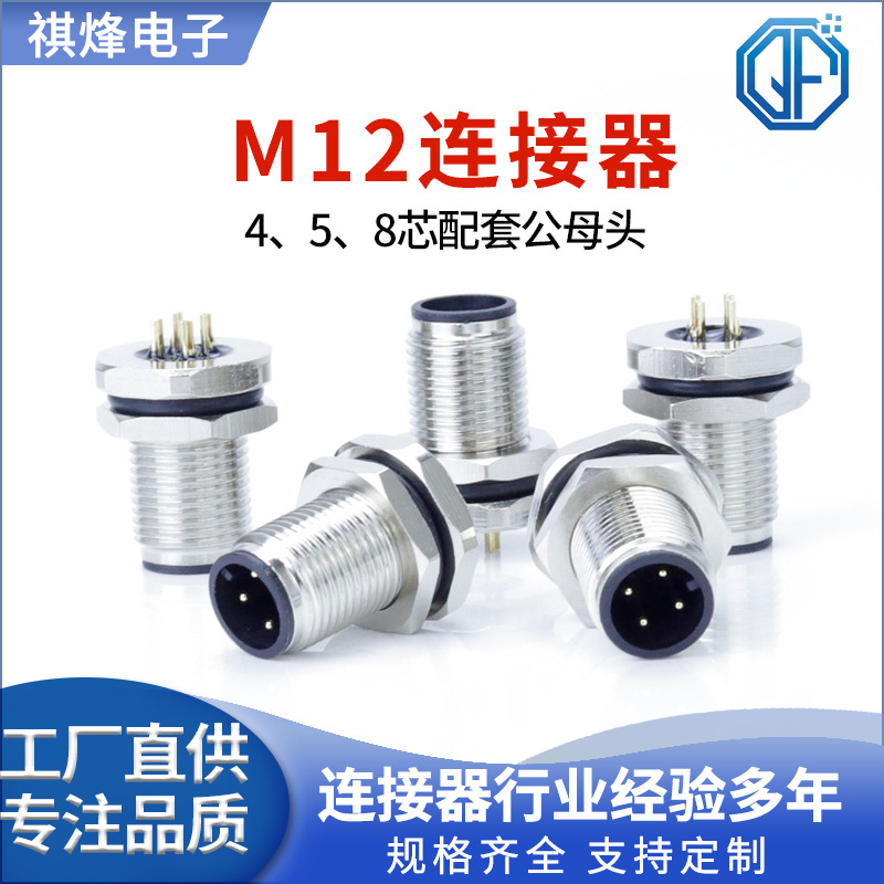 M12航空防水コネクタ、基板前4芯開口、12ピンオス・メス、金属フランジ、丸型ベース、センサープラグ
