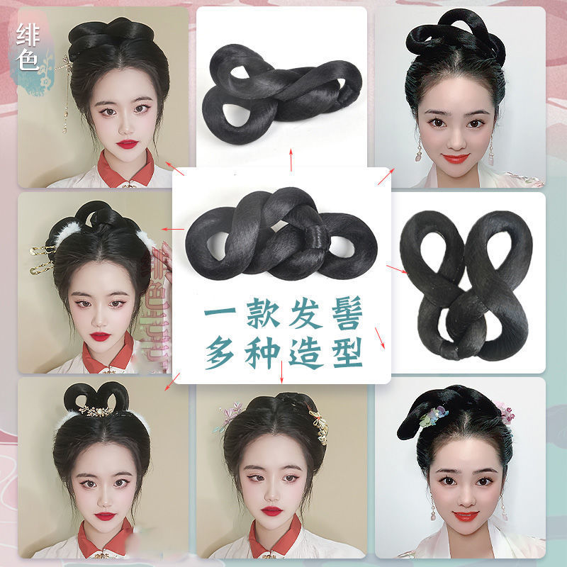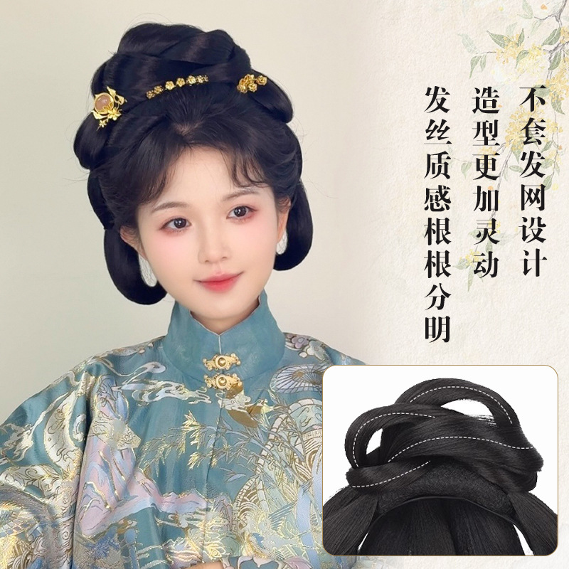 唐風ヘアスタイル一式、怠け者用オールインワン漢服ウィッグ、古代衣装の頭飾り、おだんごヘアパッケージ、古代風