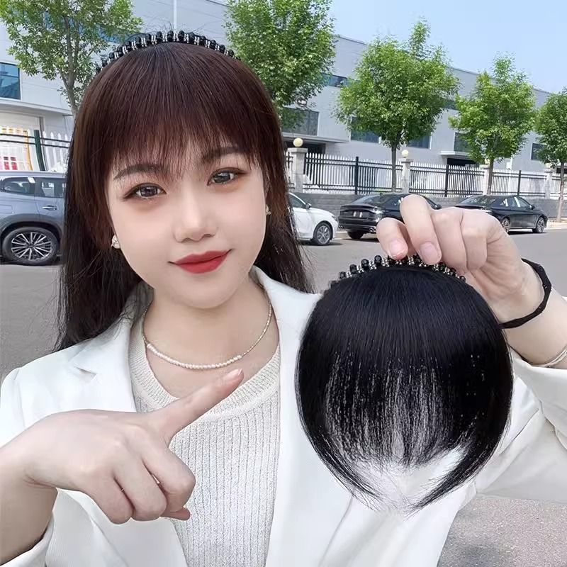 女性用ヘアフープ前髪ウィッグ、白髪をカバーする本物の髪の額とそばかす、ラインストーンヘアフープ、エア齐刘海、ヘアライン補充