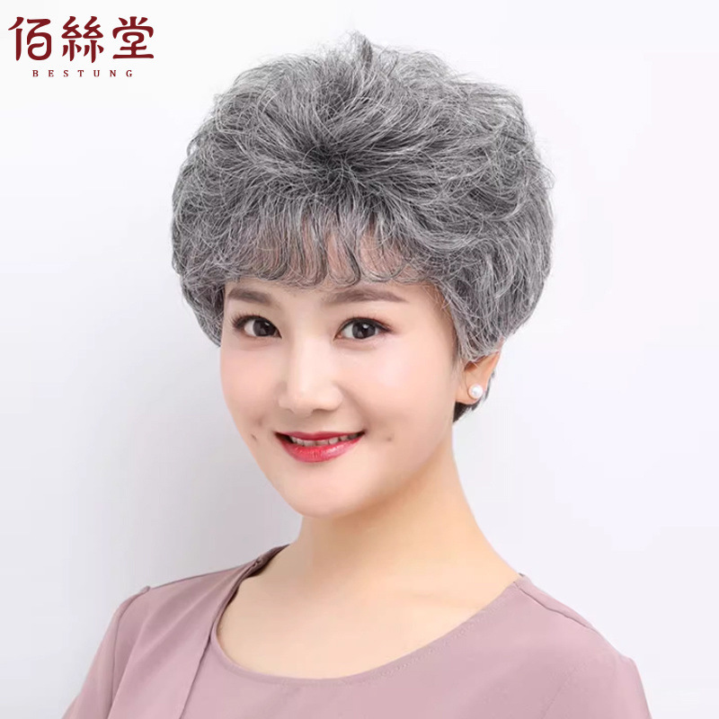 中高年おばあちゃんグレーウィッグふわふわ白髪老人フルヘッドカバー白おばさんステージウィッグセット女性用