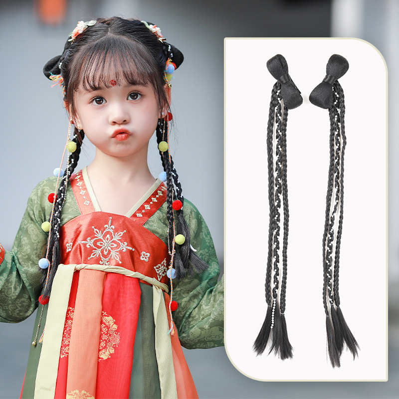 古代風のおだんごヘアアクセサリー、子供用スタイル、古代風のオールインワン女の子のリボン、怠惰な三つ編み、漢服ウィッグ、ヘアアクセサリー