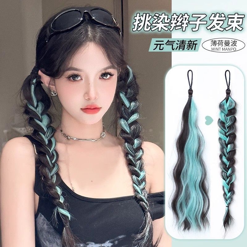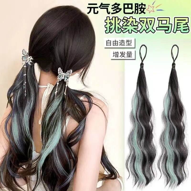 ハイライトダブルポニーテールウィッグ波状巻き毛学生ふわふわシミュレーションロングヘア自己巻きゴムバンドスタイル染め三つ編み