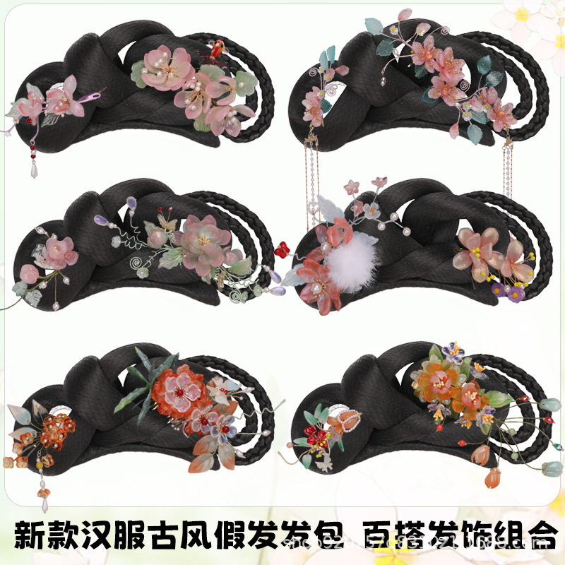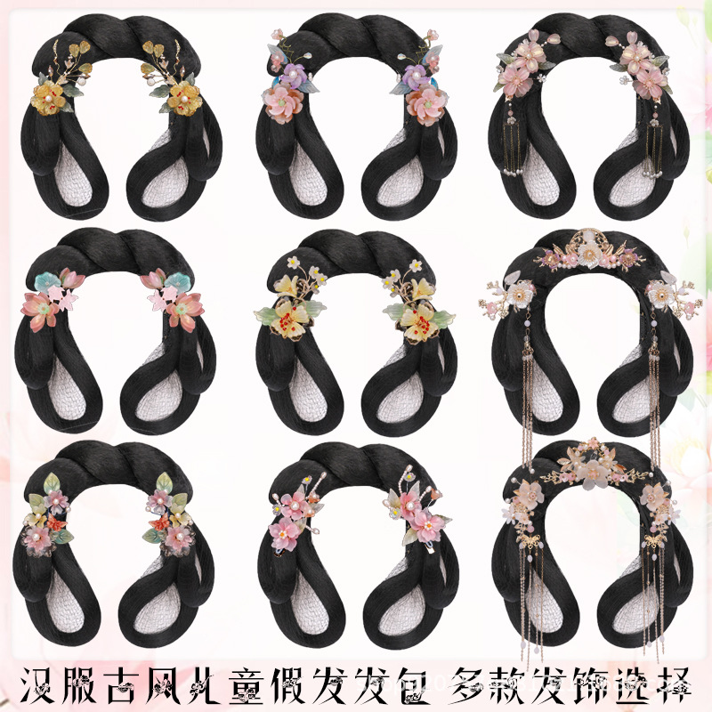 女の子の漢服ウィッグ、古代風の頭飾り、子供用ウィッグバッグ、古代衣装、毎日のおだんごヘアスタイル、ヘアパッド、ヘアアクセサリー