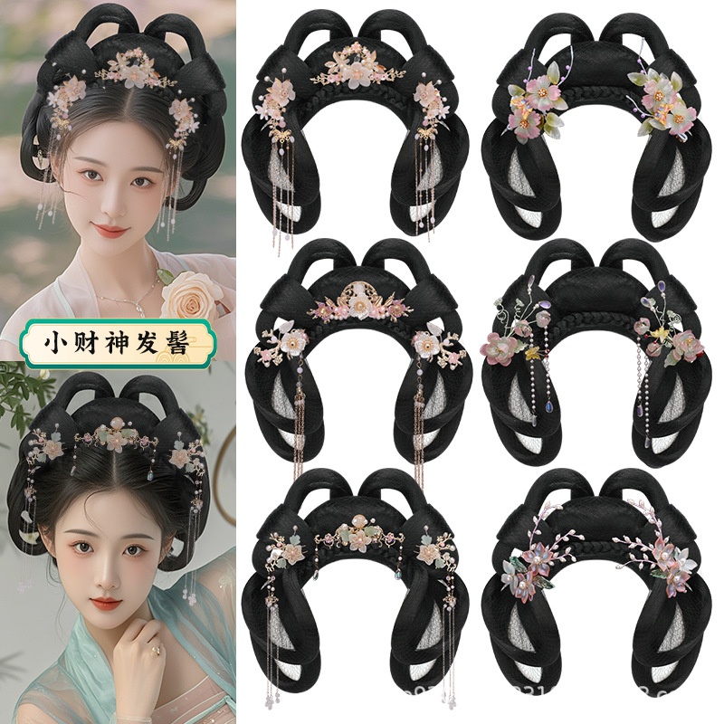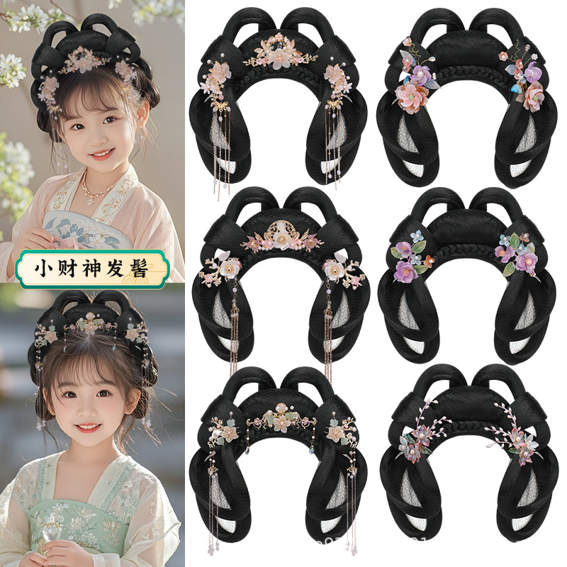 漢服子供の小さな富の神の髪の結び目古代衣装女の子のパフォーマンススタイルヘアウィッグ古代スタイル多用途妖精ヘアアクセサリー