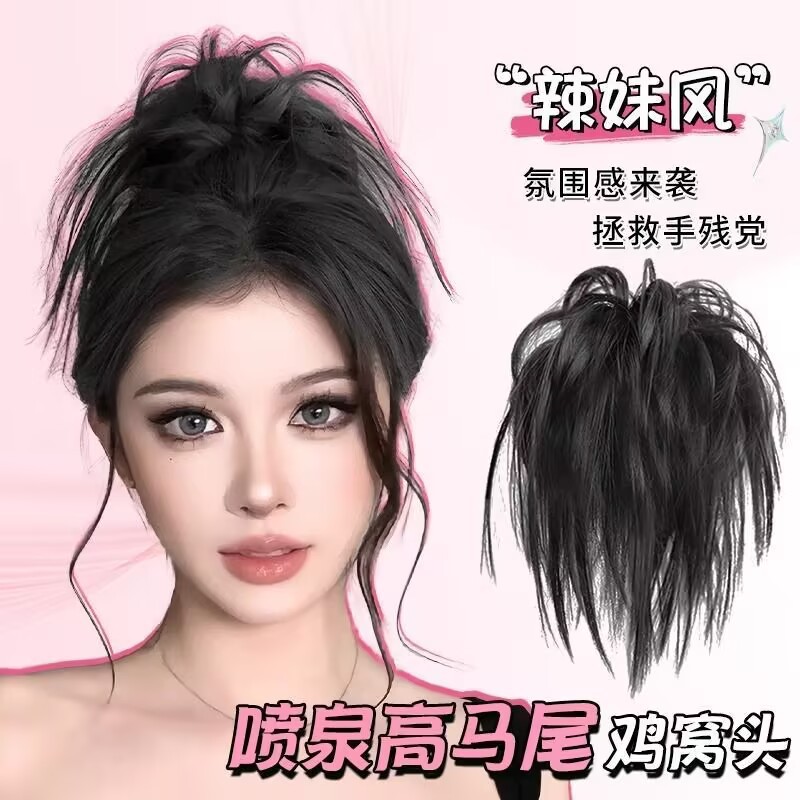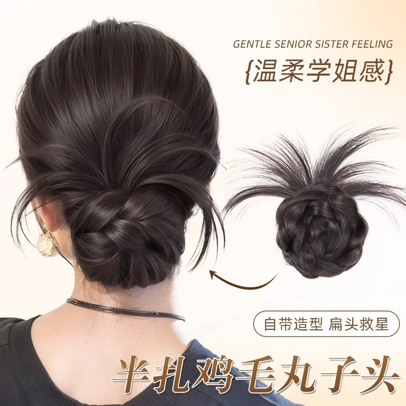 女性用の低結び目ボールヘッドウィッグ、レイジーなヘアスタイル、自然でふわふわした後頭部の鶏毛ヘアスタイル