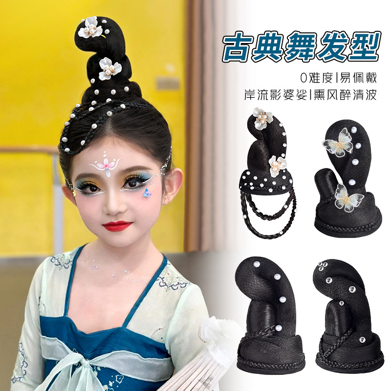 Fansha 古典舞踊子供用ヘアスタイル漢服ウィッグ包頭飾りパフォーマンス古代スタイルおだんごヘアエスニックスタイルヘアスタイリングパッド