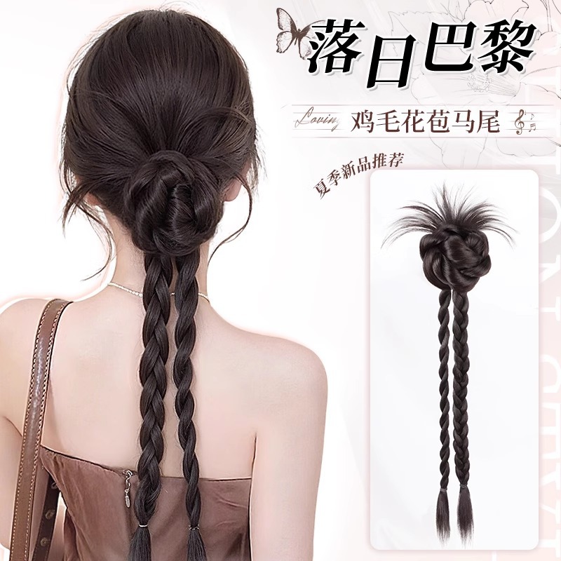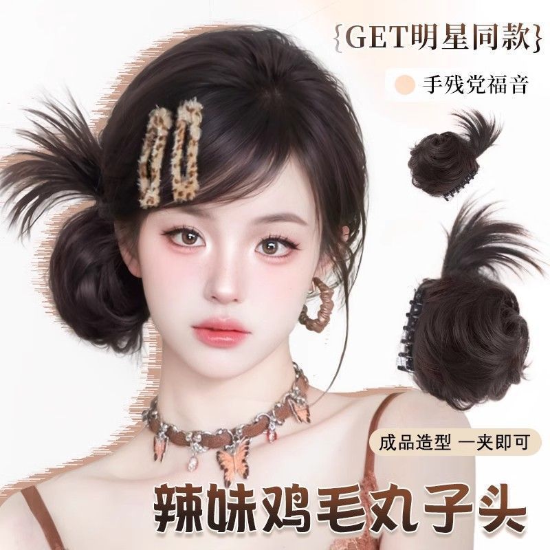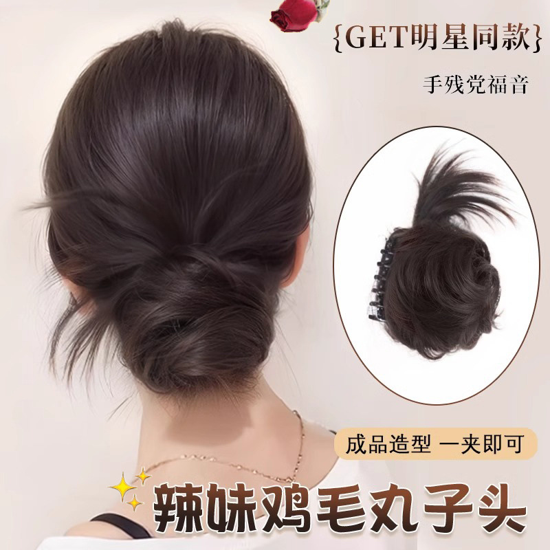 女性用の低結び目ボールヘッドウィッグ、レイジーなヘアスタイル、自然でふわふわした後頭部の鶏毛ヘアスタイル