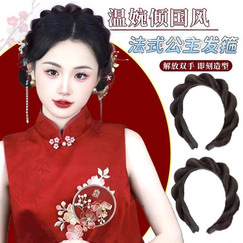 新しい中国風のヘアフープウィッグ、女性の国民風プリンセスヘア編み込みヘッドギア、怠惰な漢服チャイナドレス、高頭蓋ヘアアーティファクト