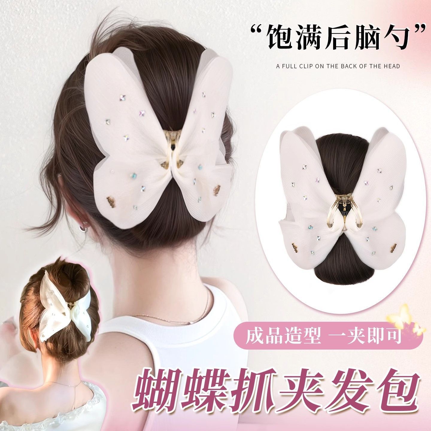 漢服ウィッグ、ヘアバンド、オールインワン古代衣装ヘアピン、おだんごヘアカバー、多用途ヘアバンド、古代風怠惰な自然蝶ヘアバッグ