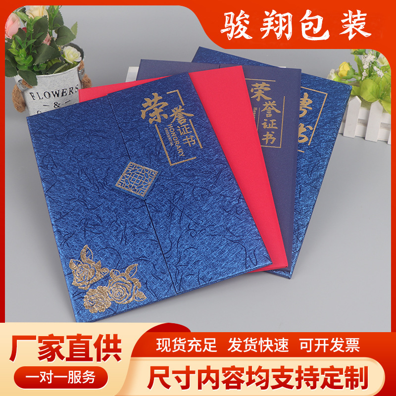 クリエイティブ三つ折り縦版角ボタン印刷ロゴ箔押し真珠光艶消し赤栄誉証明書青結納書授賞