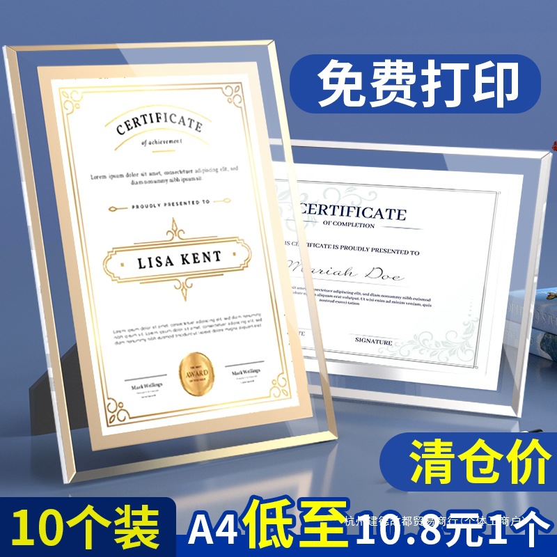クリスタルガラス名誉証明書フレームアクリルテーブルa4賞状特別な内側ページA5卒業証明書フォトフレーム賞