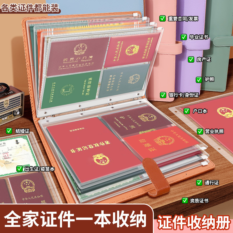 レザー多機能書類収納ブック、家族大容量書類保護カバー、戸籍簿、A4ルーズリーフ収納ブック
