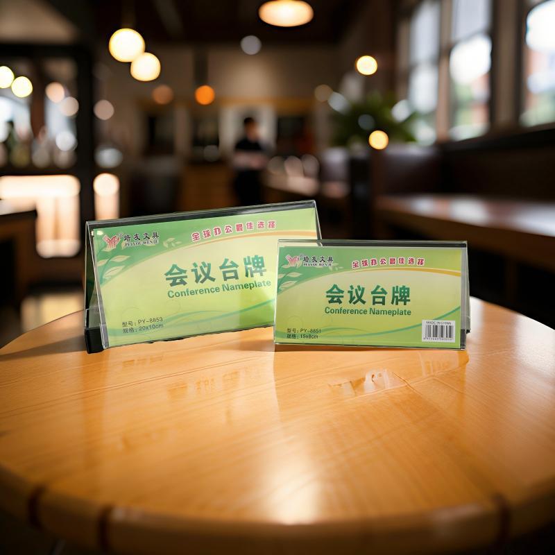 両面透明三角v型会議席のテーブルの名前台カードとお酒のテーブルがゲスト席の展示台にサインします。