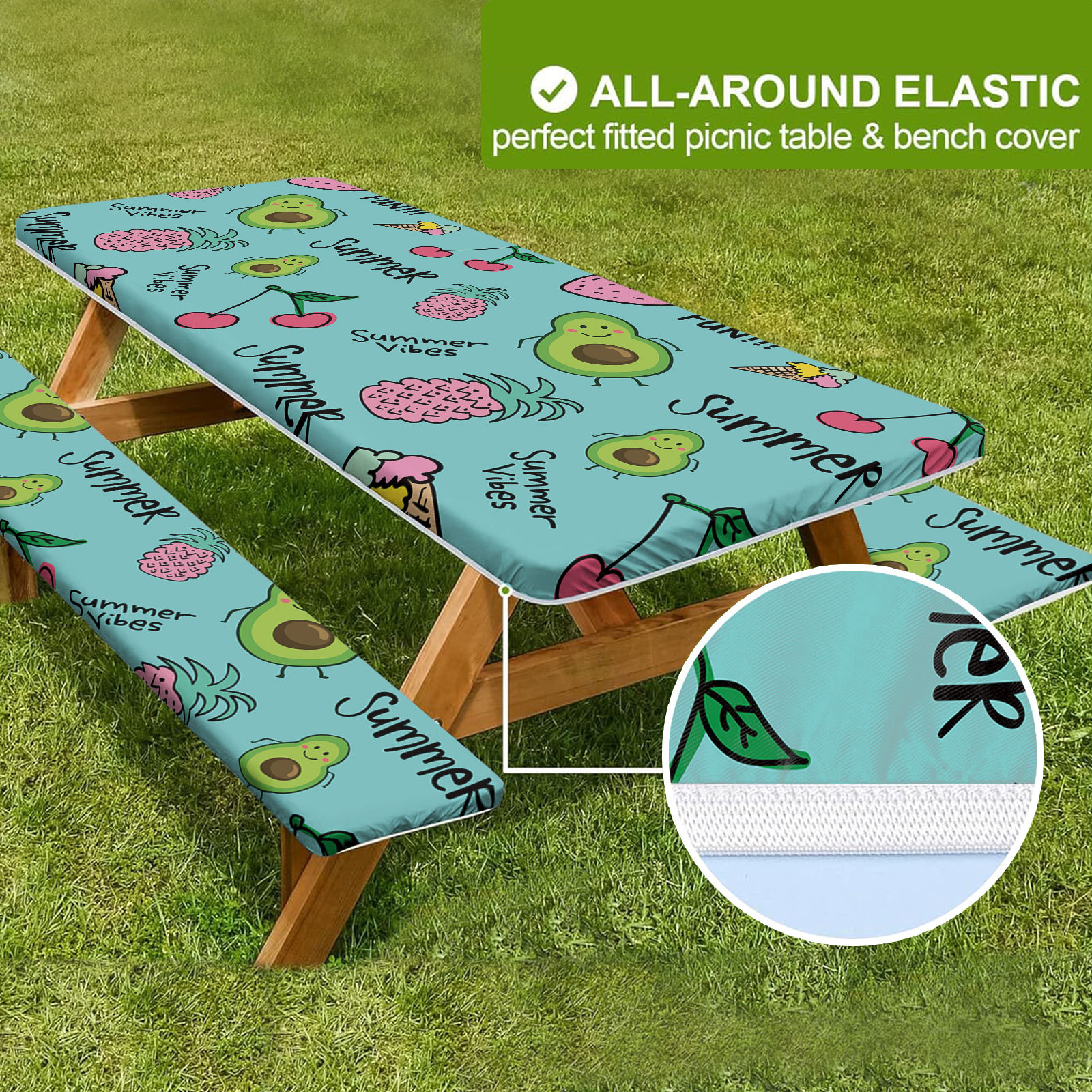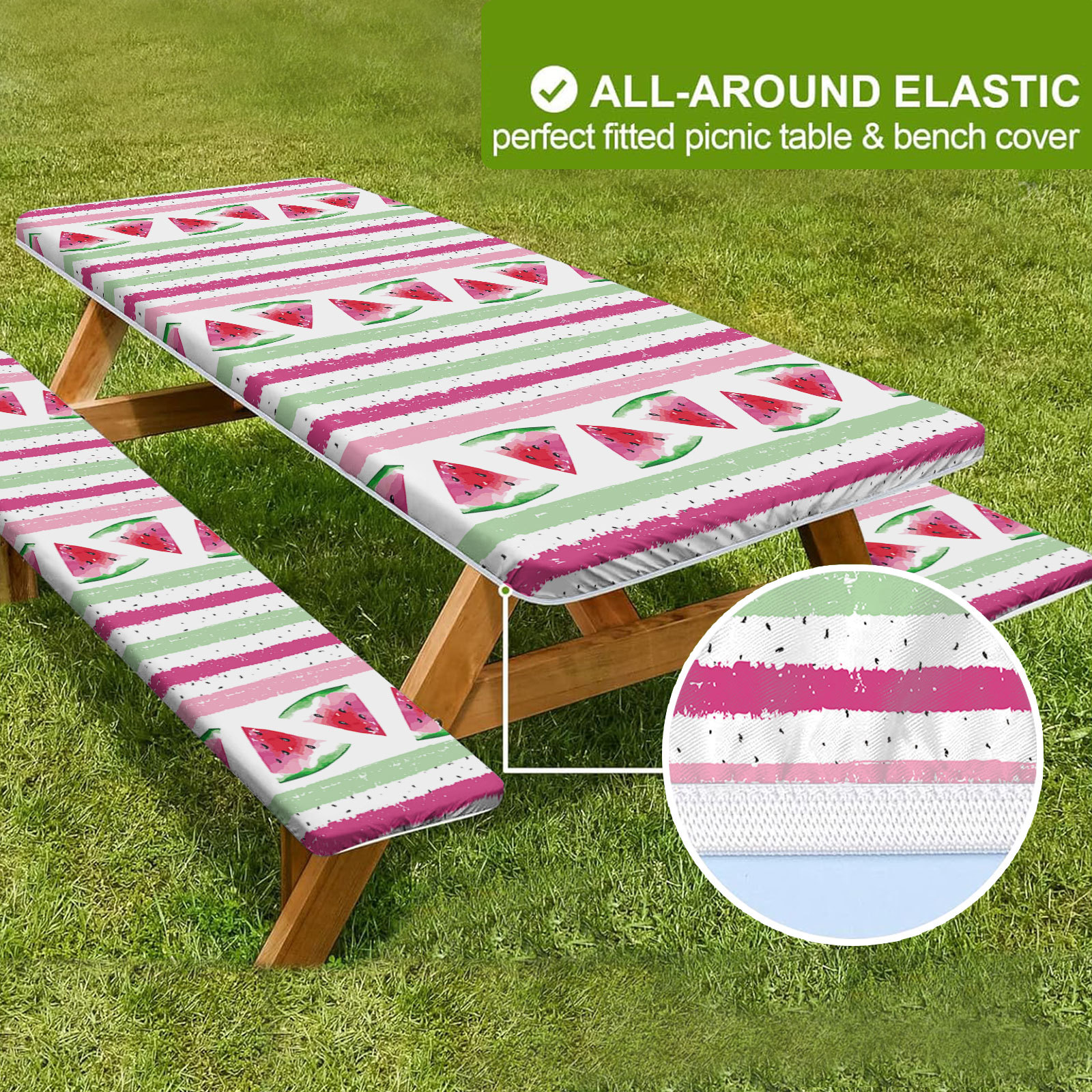 屋外防風防塵テーブルクロスカバー スイカピクニックテーブルカバー ロングチェアカバー付き 3点セット 伸縮性フィット