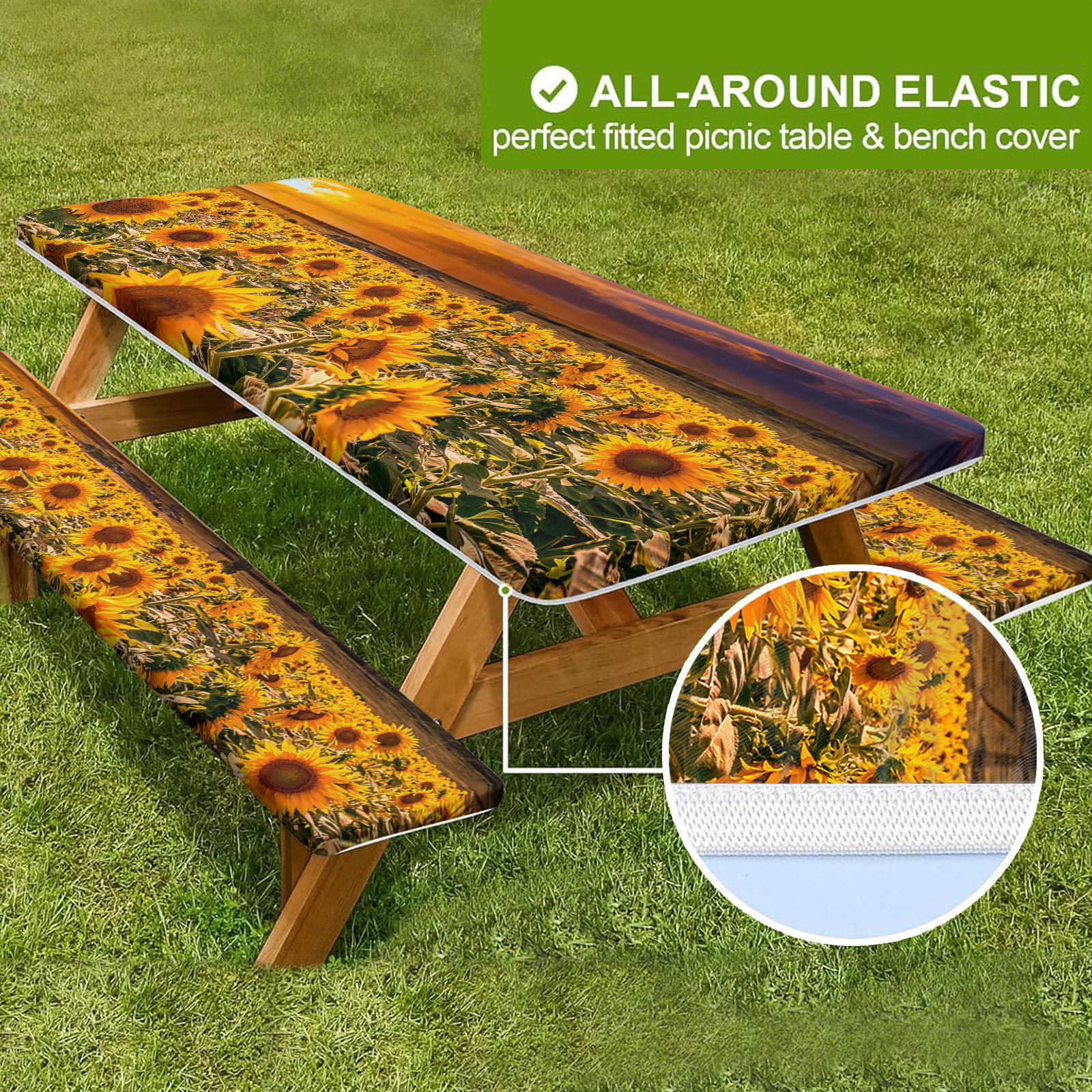 屋外防風防塵テーブルクロスカバーひまわりピクニックテーブルカバーと長椅子カバー3点セット伸縮性フィット
