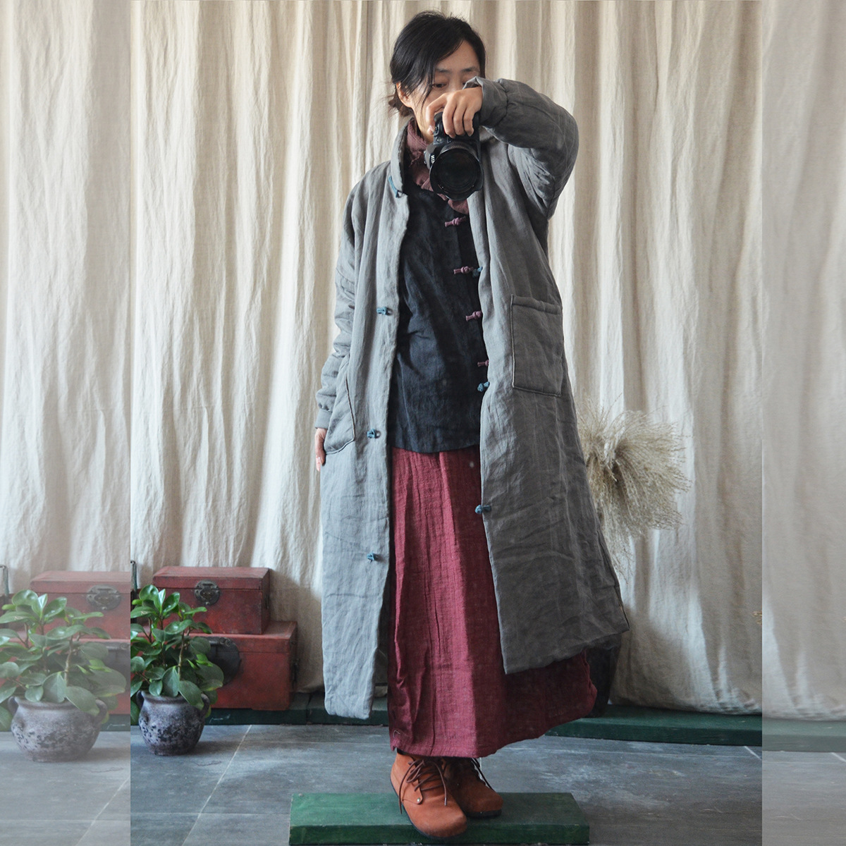オリジナル綿麻婦人服純ラミー麻レトロ盤ボタン風衣綿とロングタイプの冬綿入れの長衣