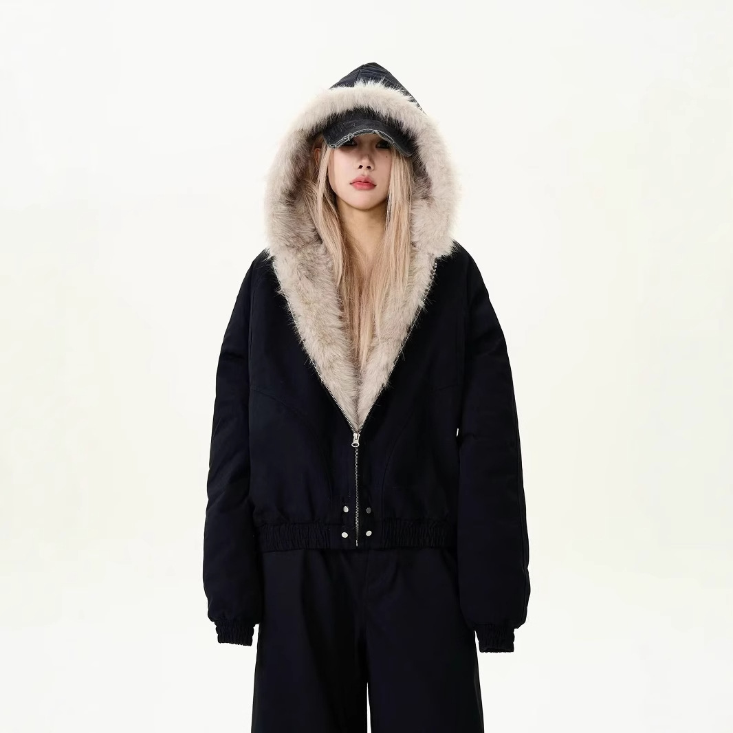 易夢玲同モデルrare帽子付き毛襟斜襟綿服ショートコート秋冬厚手パイル内胆高腰ジャケット