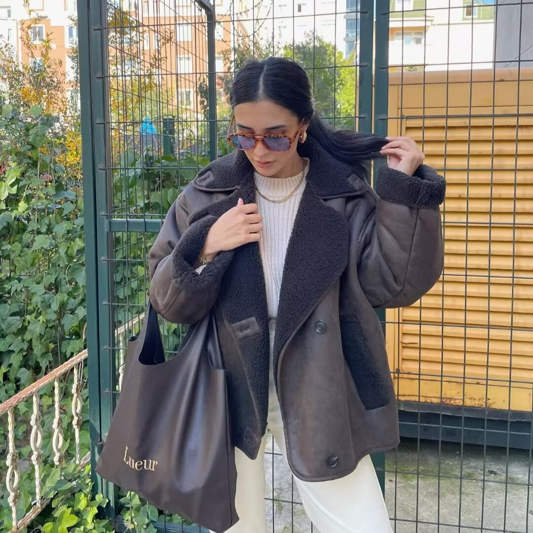 2022新型羊小毛機関車服女性冬新型毛皮一体コートファスナージャケット増厚服