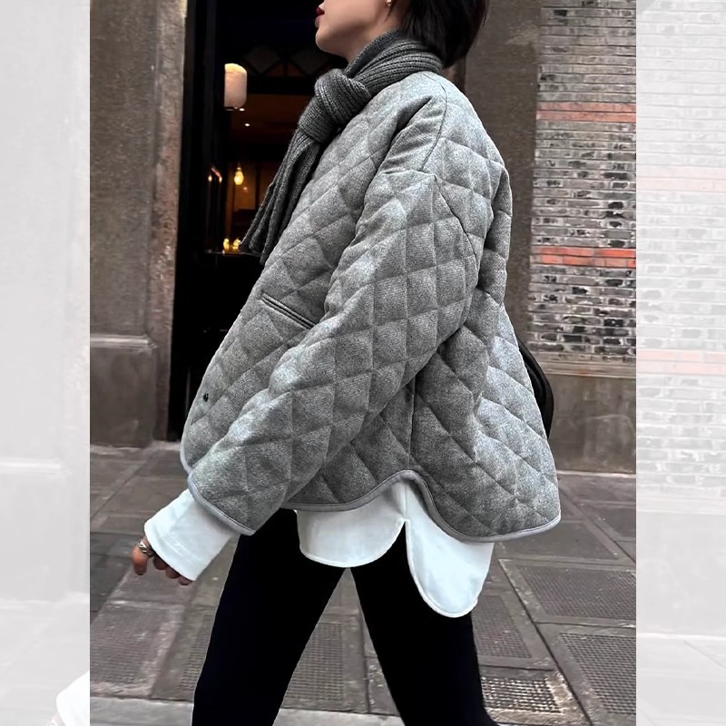 気質の高級感のある灰色の綿服の女性の冬のゆったりとしたカジュアルな百合菱格の綿服の保温は綿のコートの3623を挟みます。