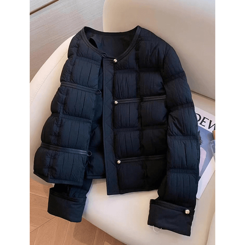 2025 秋冬の新作女性用薄手の綿コート、ラウンドネック、ショートダイヤモンドチェック柄、薄手の綿コート、ルーズジャケット