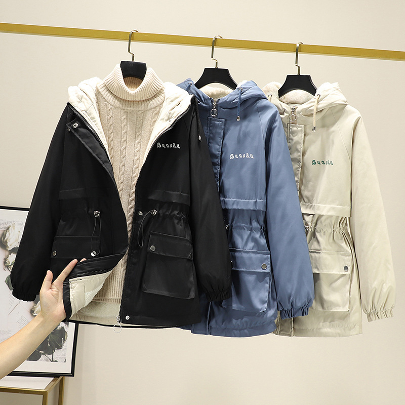 2025年冬の新作ロング膝丈ウエスト絞りパーカーコットンコート、女性用ベルベット厚手コットンコートの実物写真
