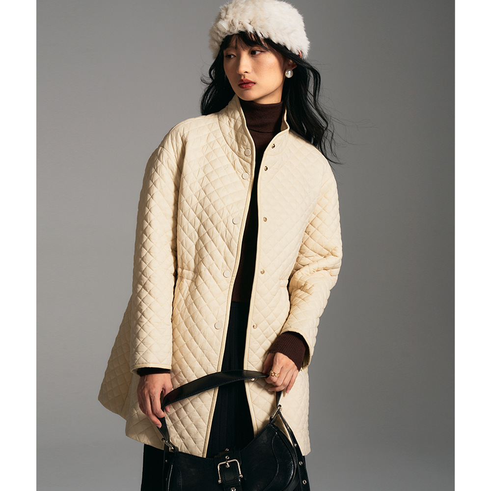 2023冬の新しい女性の綿入れの服のゆったりした中の長いタイプの菱形の格子の純色の婦人服のコートの綿入れの服