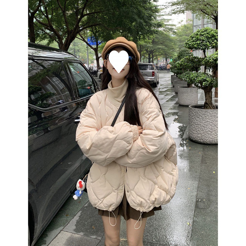 厚い菱格の綿の服のコートの女性の秋冬の2023新型のピンクの厚いゆったりとした紐の設計感の長袖の綿の服