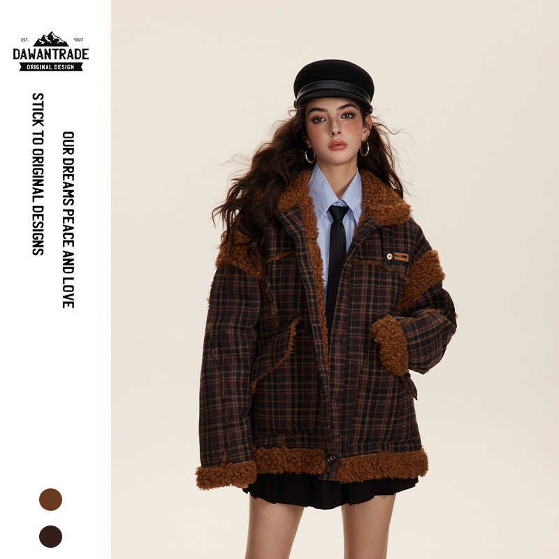 2023冬の新型美ラードのファッションの格子は羊の小毛のコートをつなぎ合わせてゆったりとしています。