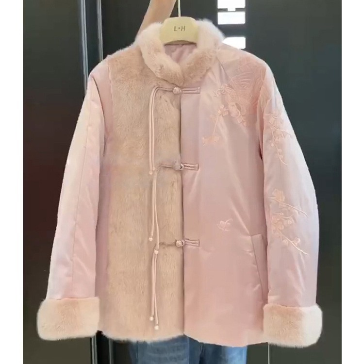 今年人気の女性用の新しい中国風ピンクボタンダウンコットンジャケット、美しい厚みのあるコットンコートとジャケット、2024年秋冬