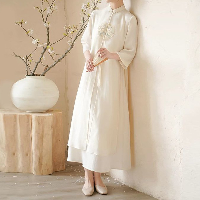 高定レトロ禅意茶服ロングスカート民族風修身着痩せ中国式刺繍加工改良チャイナドレス
