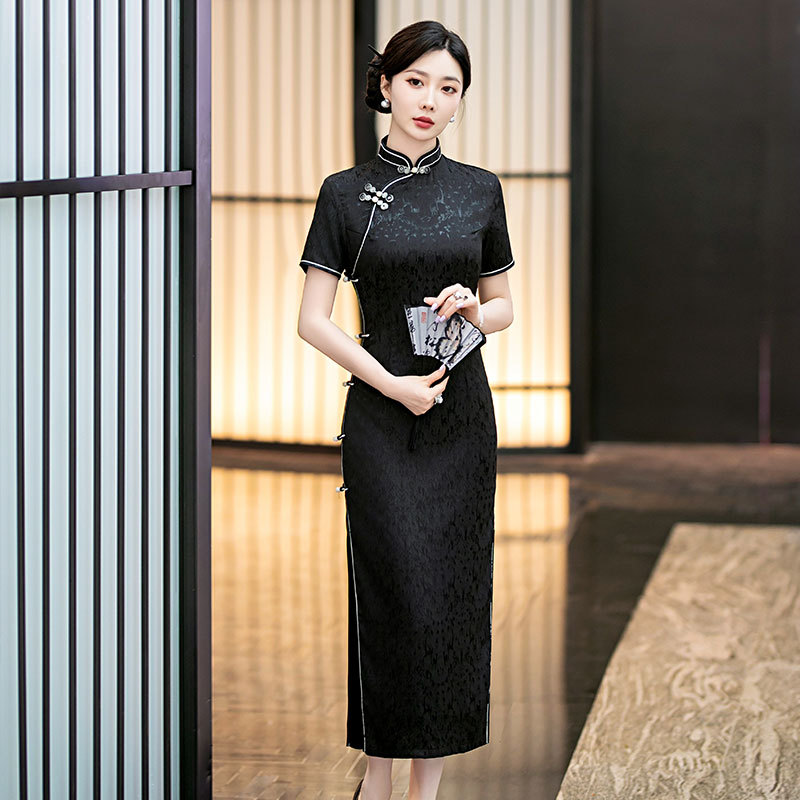 2024秋冬新作高級感改良ベルベット厚手長袖黒チャイナドレス女性日常レトロ気質チャイナドレス