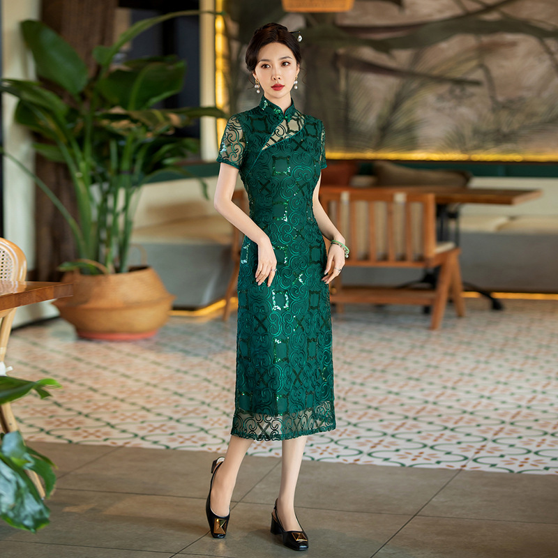 気质のウェディングドレスのパーティーのお母さんの服は春の新しい若いお母さんのレースのチャイナドレスのワンピースを卸売りします。