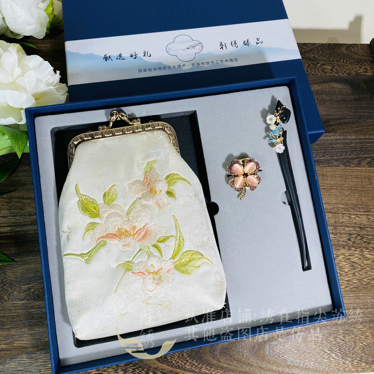 蘇州の特色の国風の刺繍のチャイナドレスの真珠の手提げの刺繍のショルダーバッグの檀木の髪のかんざしのスカーフは贈り物の箱を掛けます。