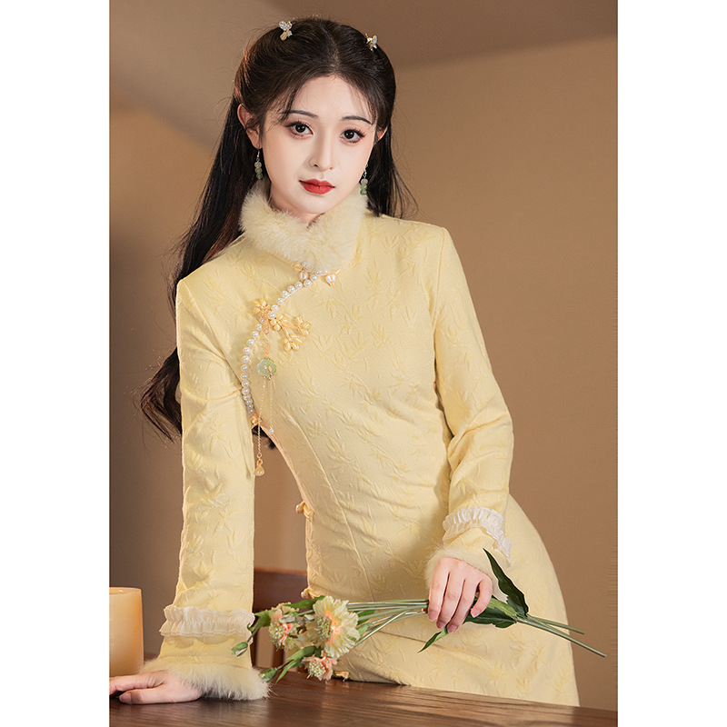 チーズ黄色チャイナドレス2024新型高級修身秋冬金新中国式日常は冬に長袖を厚くすることができる