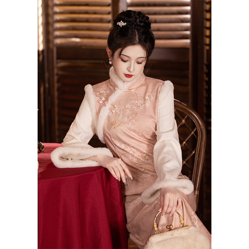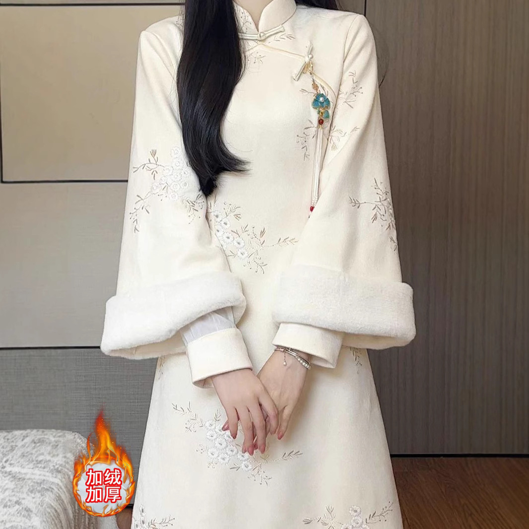 2024冬の新型ベージュ刺繍とベルベット保温改良チャイナドレスが大袖の復古風日常ワンピースを倒す