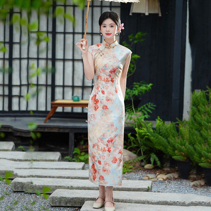 ノースリーブの中国風ロングチャイナドレス、改良された若者向けモデル、2025年新作、レトロ、スリムフィット、日常着、夏に最適