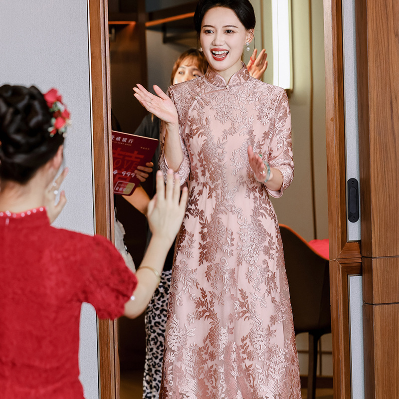 春と秋の冬の喜母の披露宴のドレスピンクの中袖のチャイナドレスの高貴感喜姑は若くて新しい中国式のモデルを見せます。
