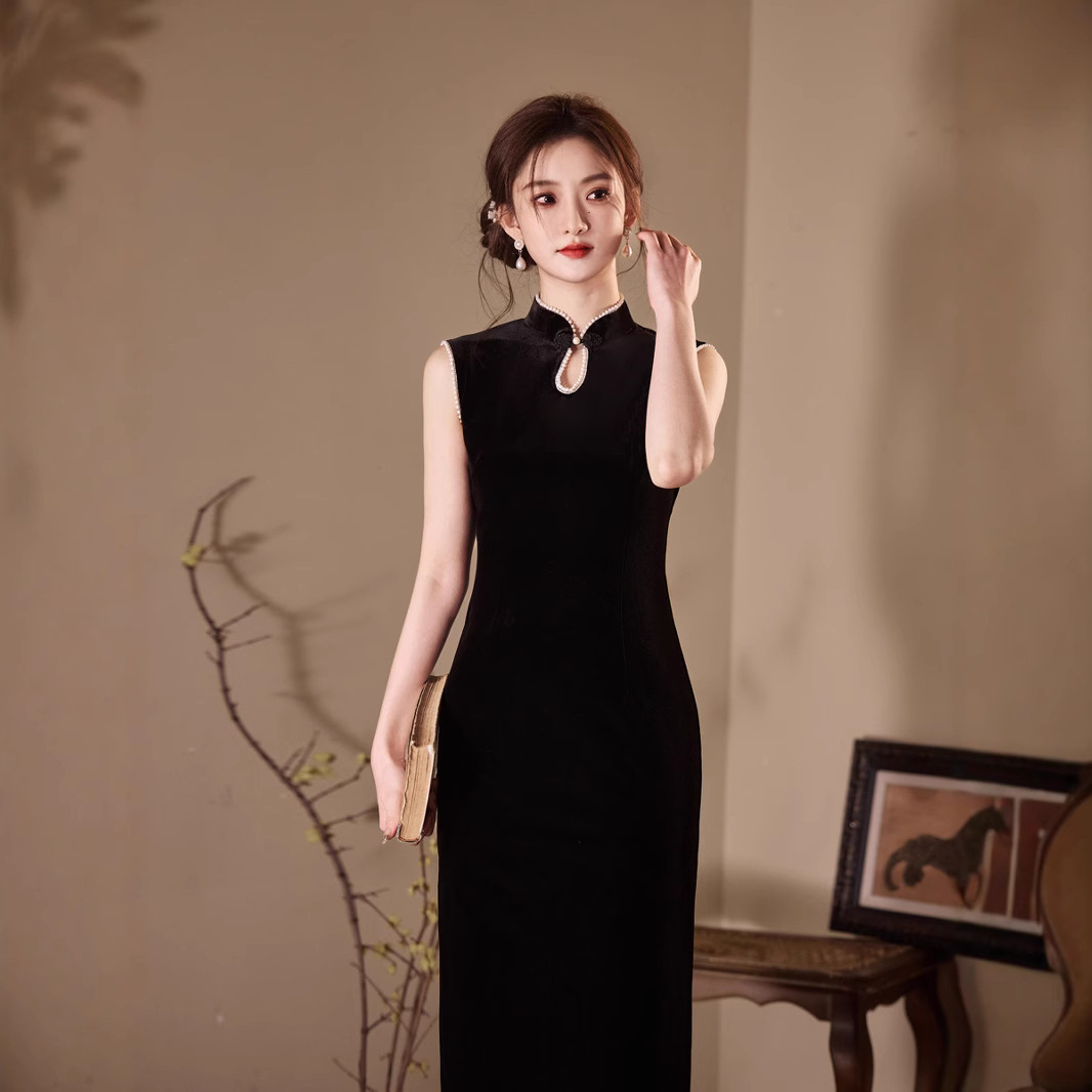 ベルベットの首の長い袖のないチャイナドレス2025春の新しいファッション改良若い少女の日常セクシーなチャイナドレス