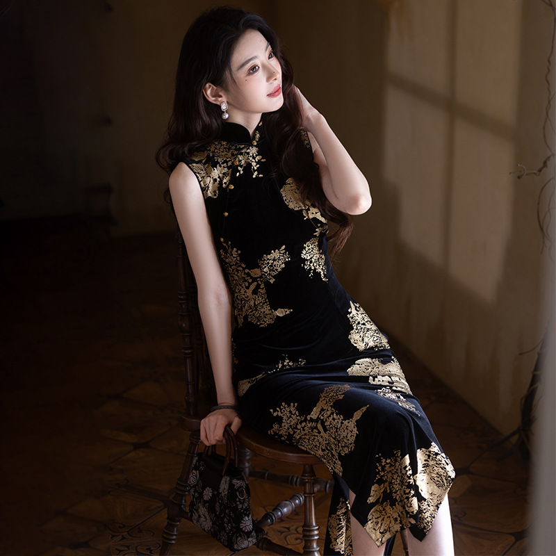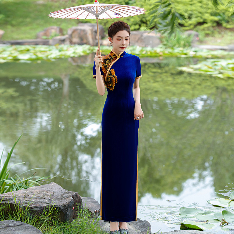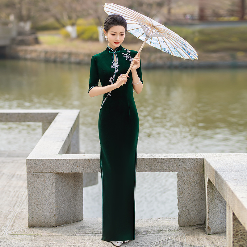 ベルベットチャイナドレス2025新しい刺繍ロングレトロエレガントなハイスリット改良されたキャットウォークチャイナドレスフラット秋色
