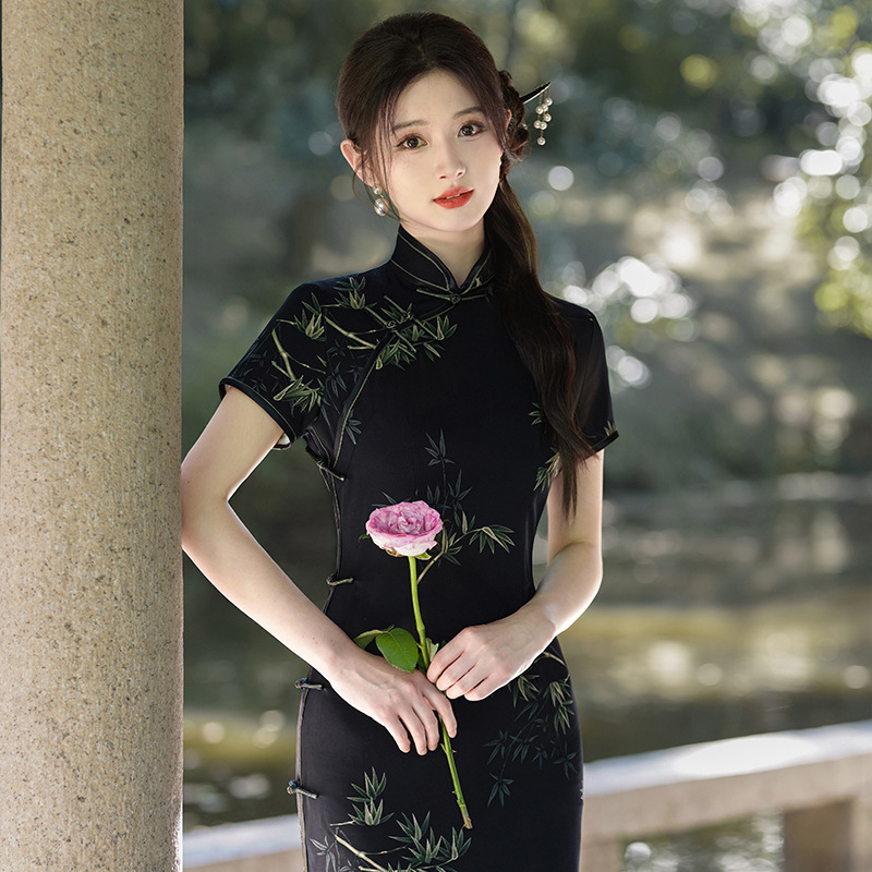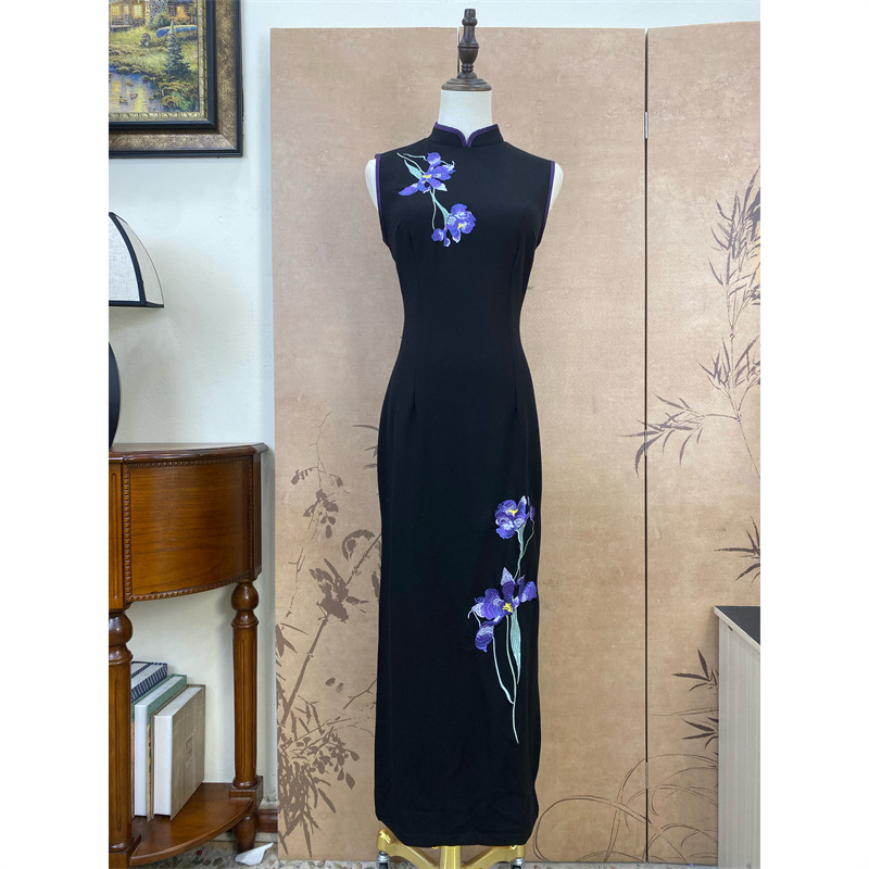 8756 # 新中国風国風気質香港工黒刺繍ノースリーブチャイナドレス春夏2025新作中長連