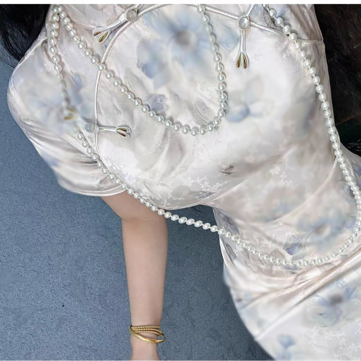 2025 春夏新作改良チャイナドレスサテンプリントデイリーバンケット女性のプラスサイズの母のパフォーマンス