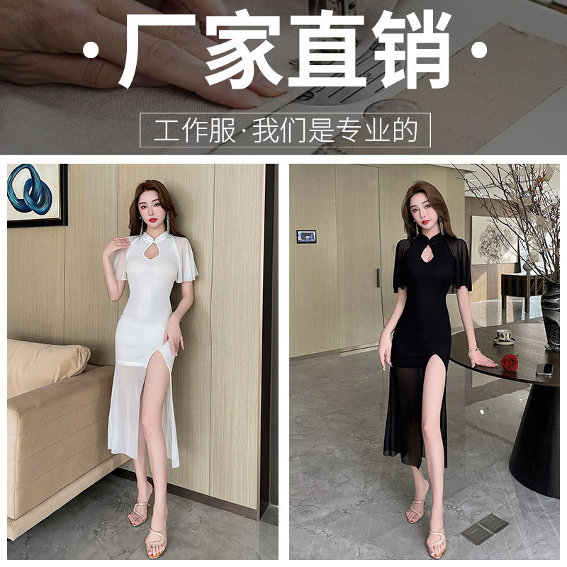 夜店セクシーワンピース夏spaソフト技師作業服会黒ネット糸透視ロングスカート1015