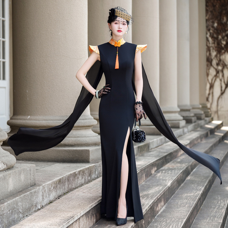 2025 新中国風の夏と秋の新しいチャイナドレスロングスカートサテン黒ドレスレトロ宴会二層パフォーマンス卸売