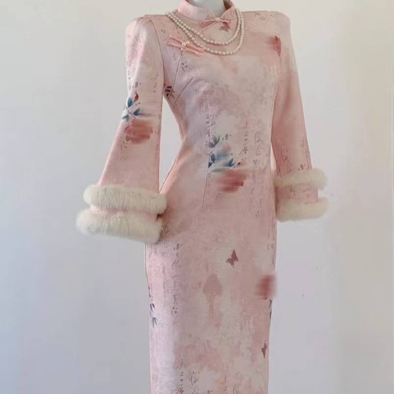 薄紫の花のチャイナドレス秋と冬の2024の新型のハイエンドの修身は気質の新しい中国式の日常を改良して着ることができます。
