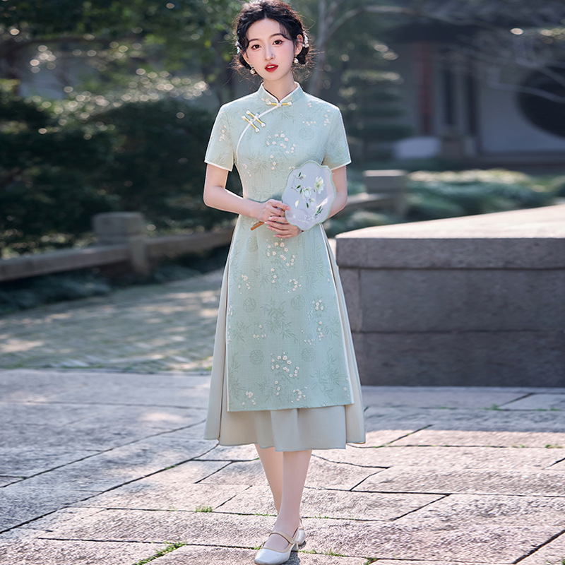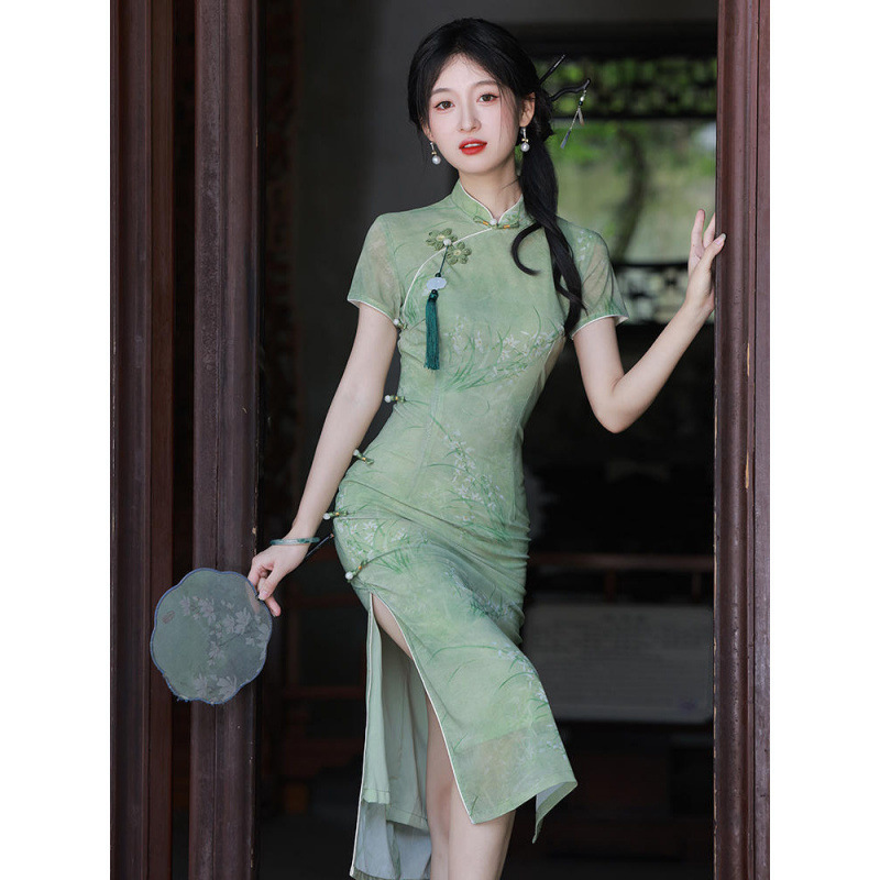 2025 新グリーンヤング改良チャイナドレス中国ドレスガールスタイルロースリット半袖多用途日常